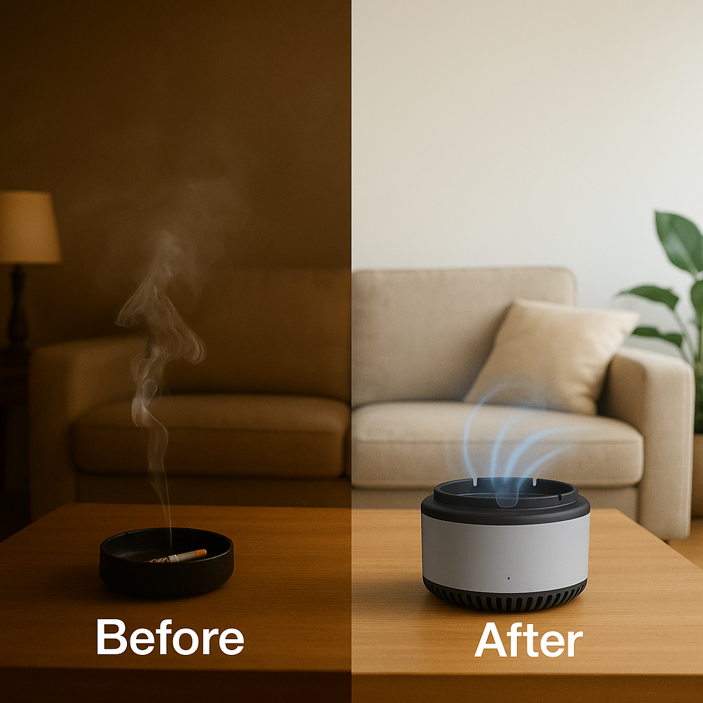 Refresh your space with this smart, dual-function ashtray. It collects ash while purifying the air to eliminate smoke and odours. Compact, powerful, and easy to use — just one touch activates the 3600 RPM fan for cleaner air instantly.